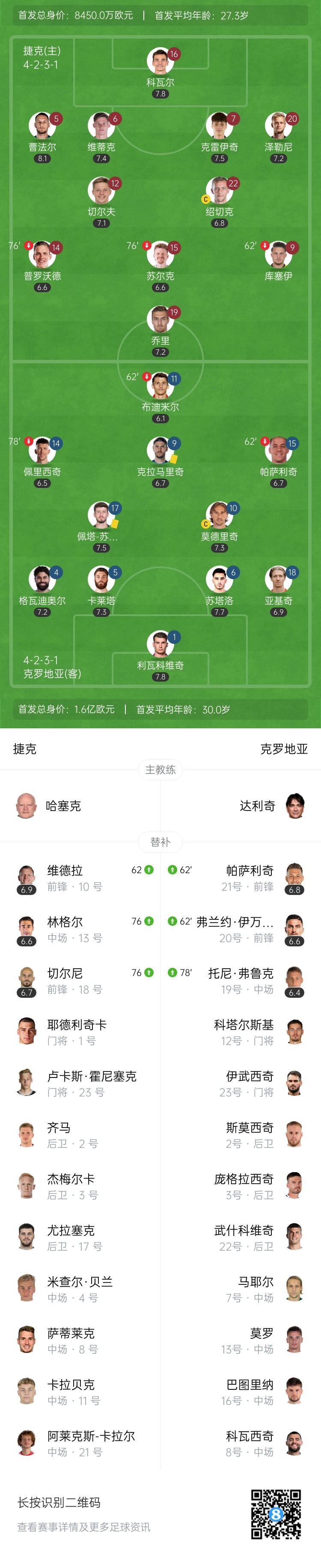 本場比賽過后,克羅地亞5戰(zhàn)4勝1平,以13個積分位列榜首,捷克多賽1場以4勝1平1負拿到13個積分位列第二。